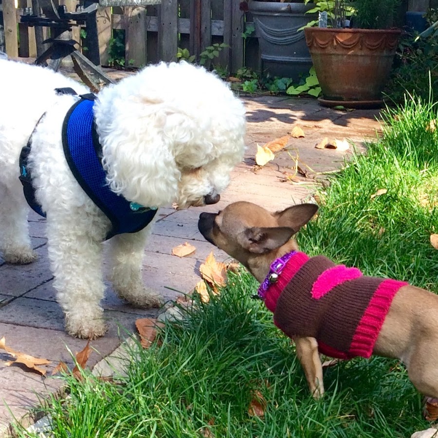 Bonnie, who was adopted from The Sato Project, carries her dish across the kitchen to eat with her new pal Clyde. So Cute!